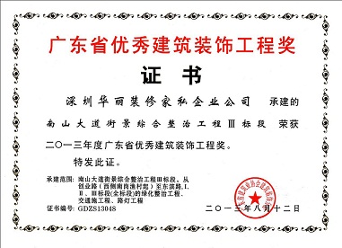 集團參股企業(yè)華麗裝修家私企業(yè)公司承建的“南山大道街景綜合整治工程Ⅲ標段”繼獲得2012年度深圳裝飾工程金鵬獎(公裝類)后捷報頻傳,再一次榮獲廣東省建筑裝飾工程最高榮譽獎“廣東省優(yōu)秀建筑裝飾工程獎”(以下簡稱“省優(yōu)”)。2013年10月廣東省建筑業(yè)協(xié)會建筑裝飾分會授予華麗公司“省優(yōu)”獎杯、牌匾及證書。該工程經(jīng)深圳市裝飾行業(yè)協(xié)會的專家嚴格檢查評比之后擇優(yōu)推薦到廣東省建筑業(yè)協(xié)會建筑裝飾分會,由省建筑業(yè)協(xié)會建筑裝飾分會組織廣東省內(nèi)的專家對“省優(yōu)”申報資料及現(xiàn)場進行嚴格的考察評比,經(jīng)“省優(yōu)”評委會評審通過,華麗公司再次榮獲殊榮。